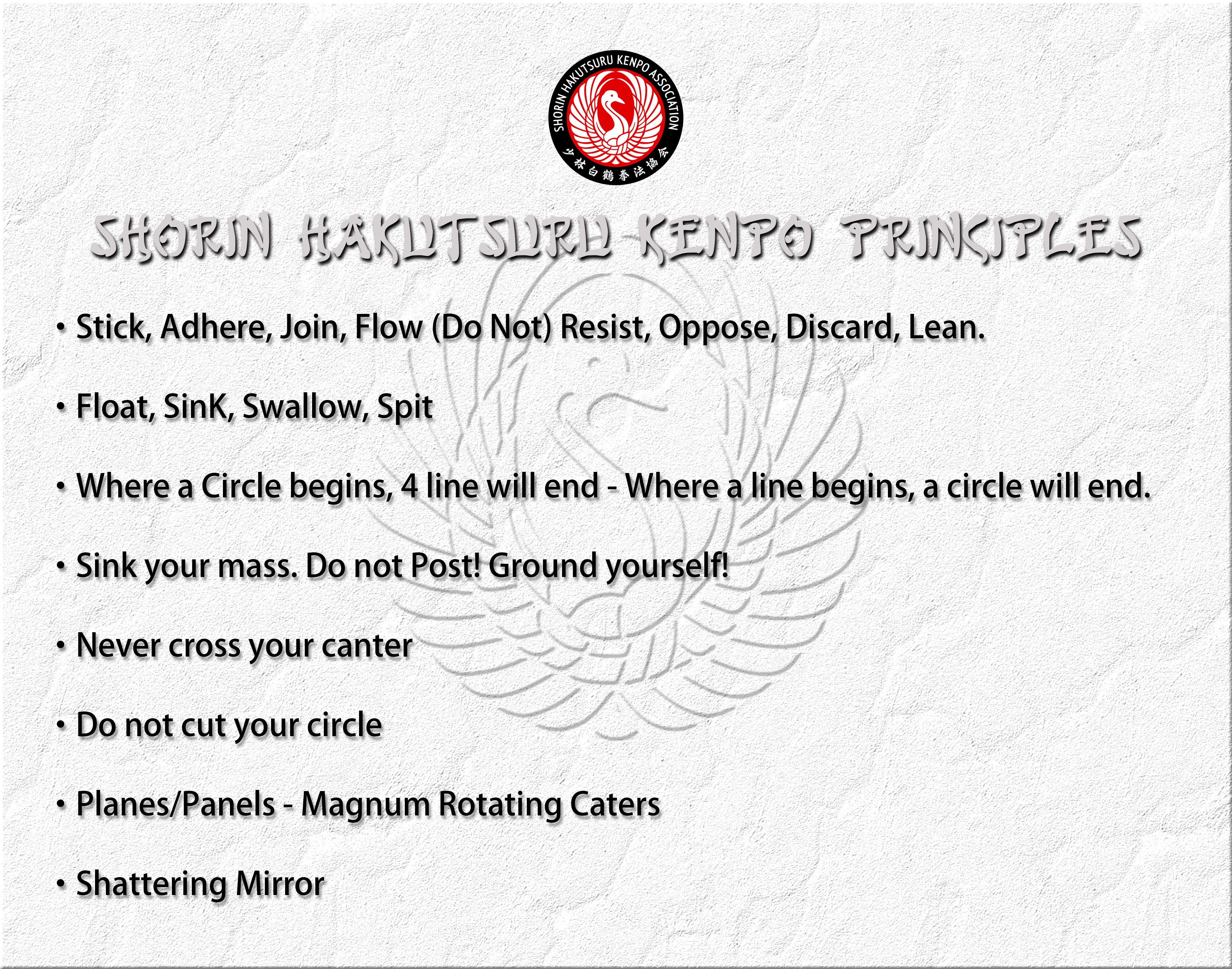Shorin White Crane Kenpo, also known as Shorin Hakutsuru Kenpo, is an ancient Chinese influenced Okinawan martial art emphasizing soft, circular, and evasive techniques that take advantage of physics and human anatomy. The art emphasizes proper body mechanics, balance, and timing, teaching practitioners how to respond to force with precision rather than relying on strength alone. Training is built around the idea that technique and practical application of physics is more important than speed, strength, and endurance.